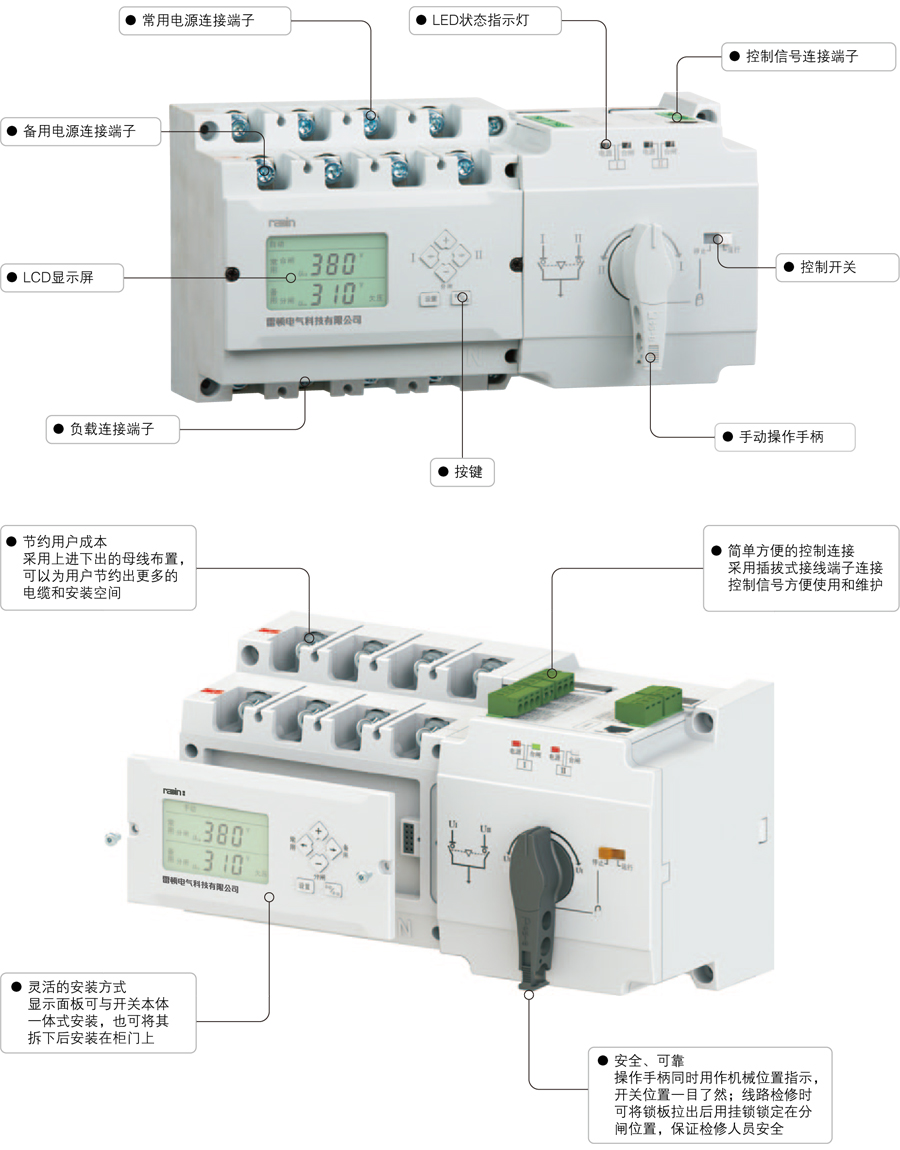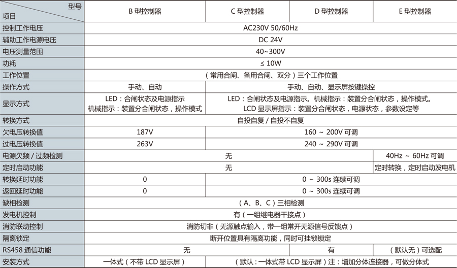 控制器具有欠壓、過壓、斷相自動(dòng)切換功能和電動(dòng)強(qiáng)制切換功能,自動(dòng)模式集成自投自復(fù)和自投不自復(fù)兩種模式,適應(yīng)不同使用場(chǎng)合;具有消防聯(lián)動(dòng)功能,滿足緊急情況下斷開負(fù)載側(cè)電源的要求。