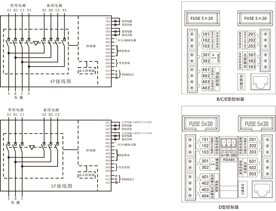 403、404- 內(nèi)部為一組常開繼電器干節(jié)點(diǎn),用于消防動(dòng)作返回信號(hào)之用;端子在正常的時(shí)候?yàn)槌i_,當(dāng)有消防信號(hào)送入控制器且開關(guān)轉(zhuǎn)換到分閘位置時(shí)403 和404 接通。(注:當(dāng)消防聯(lián)動(dòng)功能啟動(dòng)后自動(dòng)轉(zhuǎn)換開關(guān)將停止工作,若要使開關(guān)再正常轉(zhuǎn)換,必須先撤除消防信號(hào)再按下控制面板上的任意鍵后開關(guān)即可恢復(fù)正常轉(zhuǎn)換。)