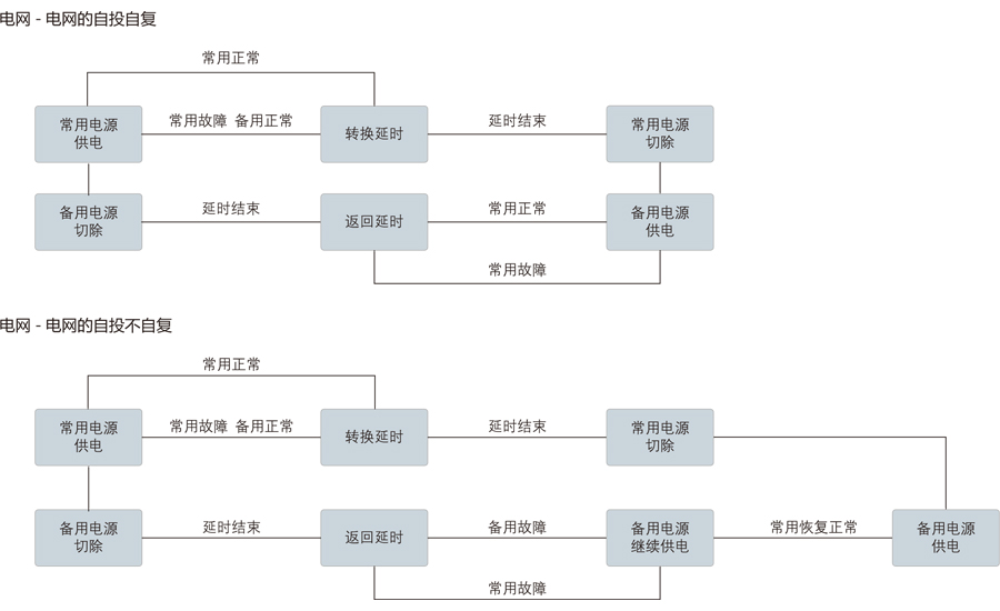 在電網(wǎng)- 電網(wǎng)的應(yīng)用中,自動(dòng)轉(zhuǎn)換開關(guān)可以提供自投自復(fù)和自投不自復(fù)兩種轉(zhuǎn)換類型