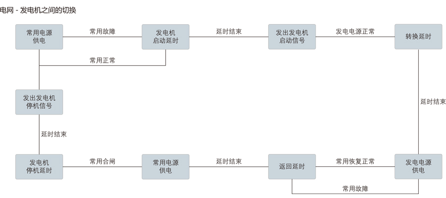 返回延時(shí)是在由備用電源供電后,判斷常用電源又可用后,開始計(jì)算延時(shí),當(dāng)延時(shí)結(jié)束后由備用電源轉(zhuǎn)換至常用電源。此延時(shí)可以等待常用電源在給負(fù)載供電前輸出穩(wěn)定。