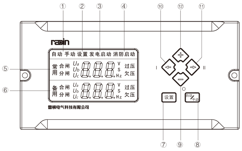 9:分閘按鈕:在手動(dòng)控制方式下如果兩路電源有任意一路正常時(shí)按下此按鈕開關(guān)切換到分閘位置;在設(shè)置狀態(tài)時(shí)此鍵為設(shè)置參數(shù)減按鈕;