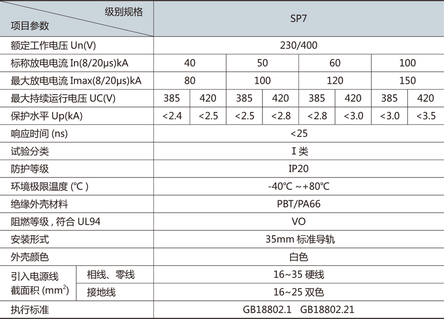 SP7系列電涌保護器,適用于交流50/60Hz,400V及以下的TN-S、TN-C、TN-C-S、 TT、 IT 等供電系統(tǒng),用在LPZOA與LPZO1區(qū)或LPZOB與LPZ1區(qū)的界面處的等電位連接,對電網(wǎng)因雷擊或浪涌進行保護。