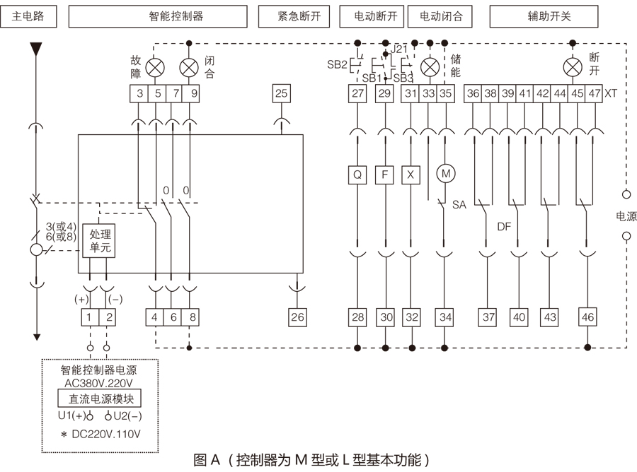 斷路器總體接線端子共有47 個,接線簡單、便于用戶使用,接線圖見圖A、圖B、圖C智能控制器其它接線