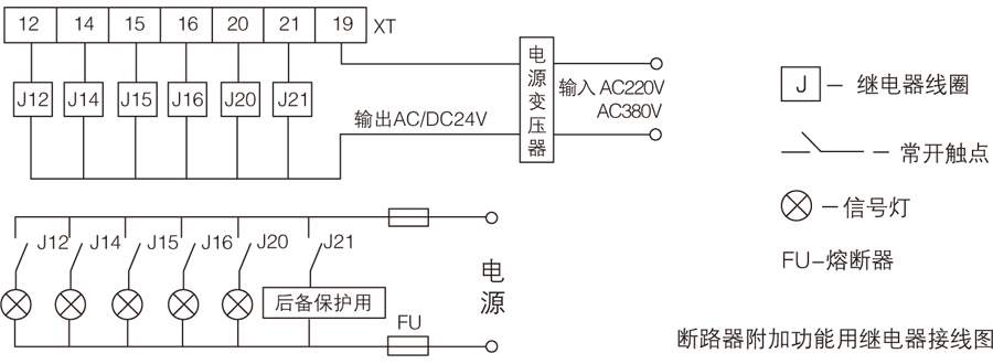 1) 控制器訊號輸出通過端子12、14~16、20、21 帶動外附繼電器J 對外輸出接點動作訊號。
