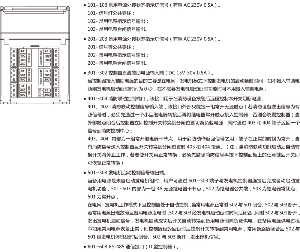 ● 發(fā)電機(jī)啟停控制功能:控制器留有一組繼電器干節(jié)點(diǎn)來控制發(fā)電機(jī)的啟動(dòng)和停止,并且可以人為設(shè)置發(fā)電機(jī)的啟動(dòng)延時(shí)時(shí)間和停機(jī)延時(shí)時(shí)間(需接入DC15-30V 的輔助電源);
